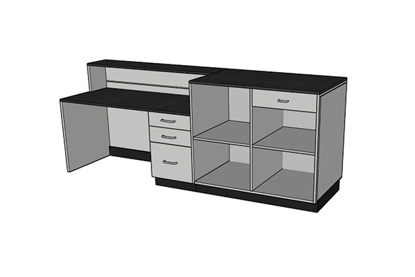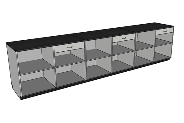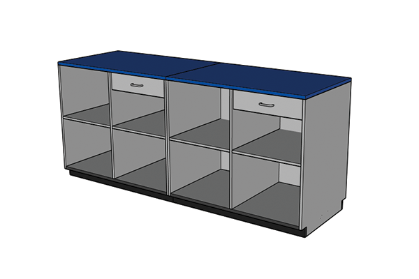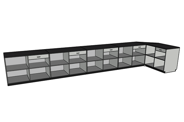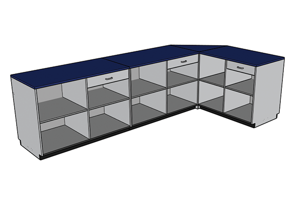 Installation of Big Box cabinets is a snap; simply set each cabinet in place, level with shims, fasten together and finish with rubber base molding. Power and IT cables can be run by drilling a few holes from the inside panels. The tops come attached to each cabinet making it simple to set in place.