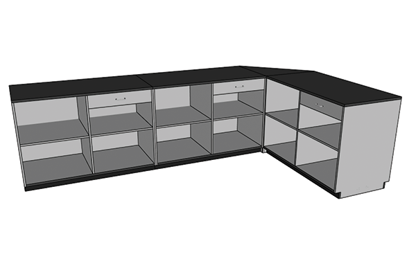 Big Box sales counters are a standard cabinet design that can easily be customized to accommodate your store’s customer service, branding, and merchandising requirements. Cabinets stand 42″ high are available in 5′ and 4′ widths and a corner unit. You can easily create a straight, L-shape, or U-shape cash wrap counter to fit your sales staff size. We even have a transaction desk option that allows for employees to stay productive at the counter and accessible to customers as they enter the showroom.